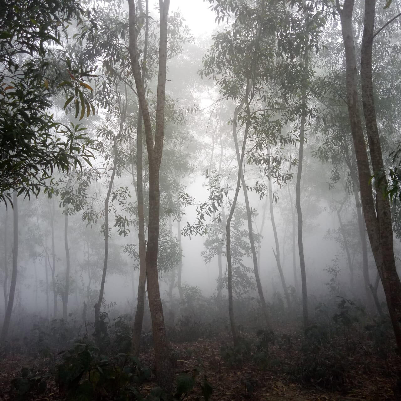 A fog-covered forest with tall trees stands quiet and isolated, reflecting the harsh environment faced by the Rohingya. By Abul Kalam.