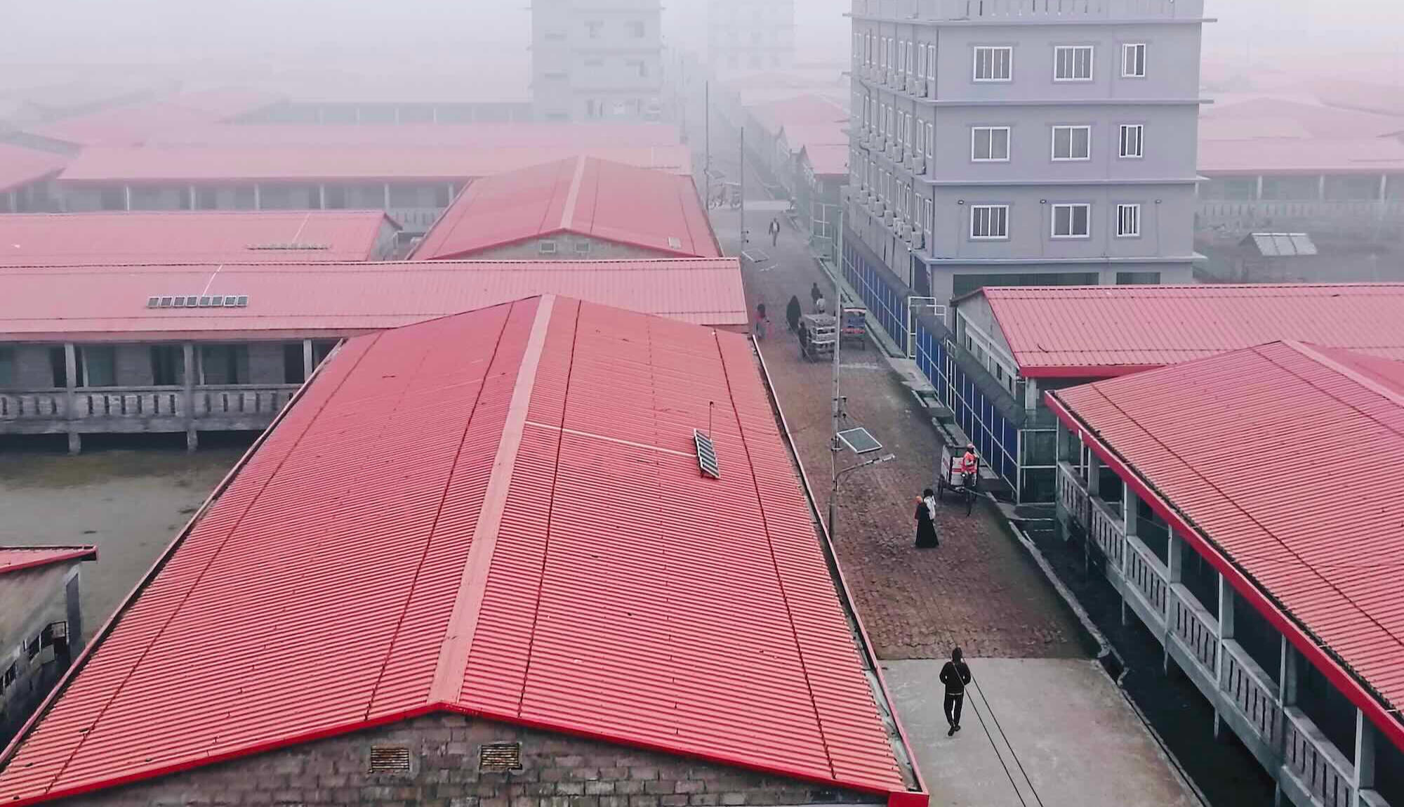 Bhasan Char: 1. Four fishermen walk across a barren, foggy expanse, carrying their nets and equipment on their shoulders. Seeking a livelihood in challenging conditions. 2. A small group gathers around a makeshift fire, surrounded by fog-covered shacks (local market). 3. The distinctive red-roofed buildings that make Bhasan Char immediately recognisable rise out of the fog. Yet, their geometric order can't resolve the challenges that linger beneath this facade of order.
